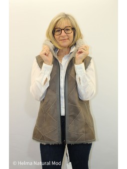 Gilet sans manches en peaux d'agneau, contour capuche en fin racoon Gilet réversible Motif patchwork Fermeture avec zip Poches latérales Le gilet confortable, chic et élégant de votre automne-hiver. Besoin d'un conseil ? N'hésitez à nous contacter ici ou sur Instagram @helmanaturalmod.