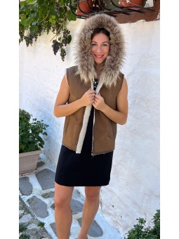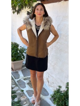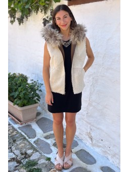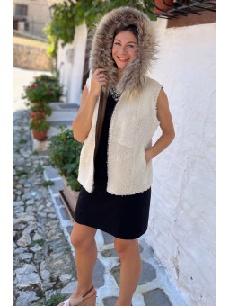 Gilet en agneau sans manches avec col, poches latérales et fermeture en zip.