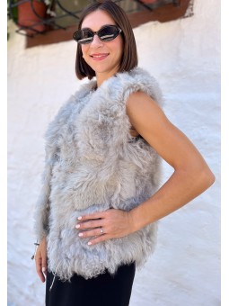 Gilet en agneau sans manches avec col, poches latérales et fermeture en zip.