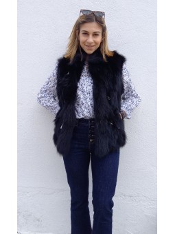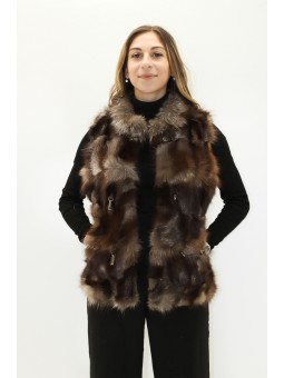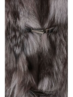Gilet en fourrure de renard sans manches avec col, poches latérales et fermeture par des boucles argentées.