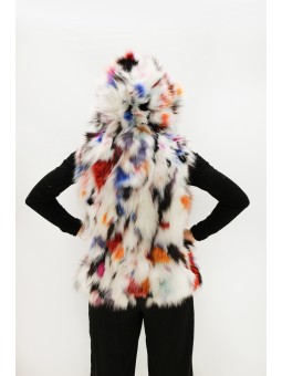 Gilet renard sans manches avec capuche et cordons de serrage en bas.